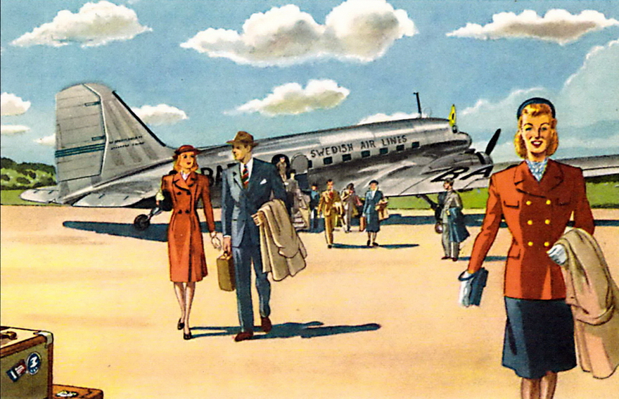 | Välklädda passagerare lämnar DC-3:an efter en oförglömlig upplevelse. Illustration i SAS Museet i Oslo-s kalender i augusti 2011. |